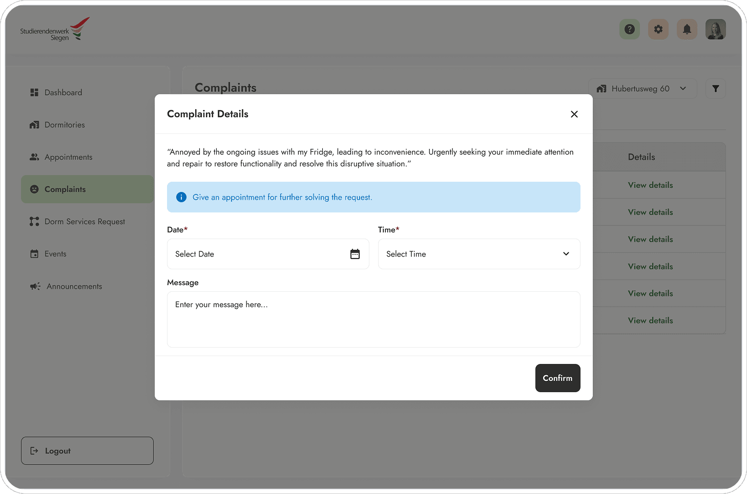 Studierendenwerk Siegen manages student housing across multiple dormitories in Siegen, Germany. Every interaction - applying for a room, reporting a broken appliance, asking a simple question required an email, a phone call, or a physical visit to an office. I had a unique starting point as I was a resident myself and faced similar problems myself. That gave me direct access to the friction and informal trust with other students that made honest research conversations possible. But being a resident also meant I had assumptions I needed to test rather than just design around. So before touching any screens, I treated this as a genuine research problem.