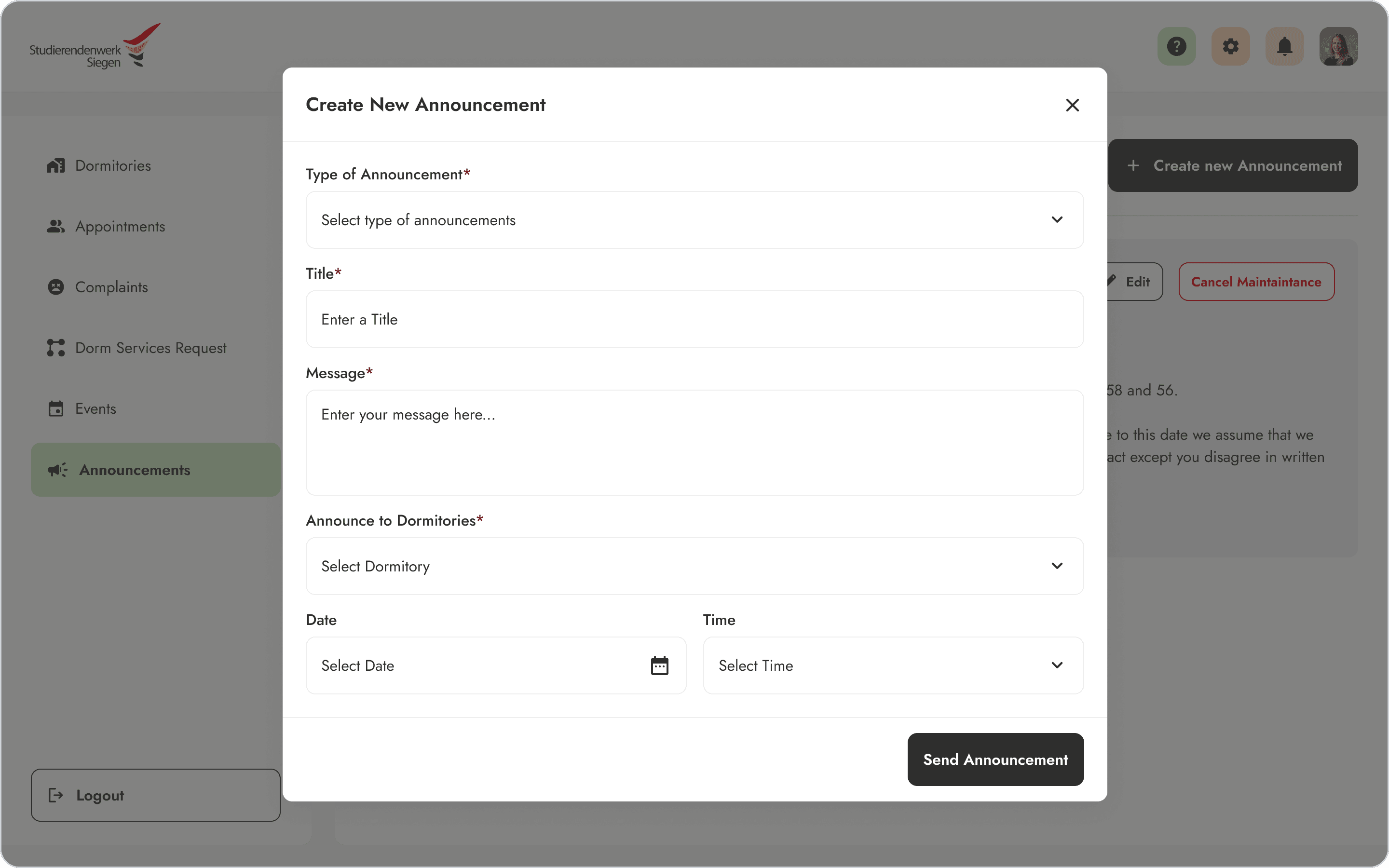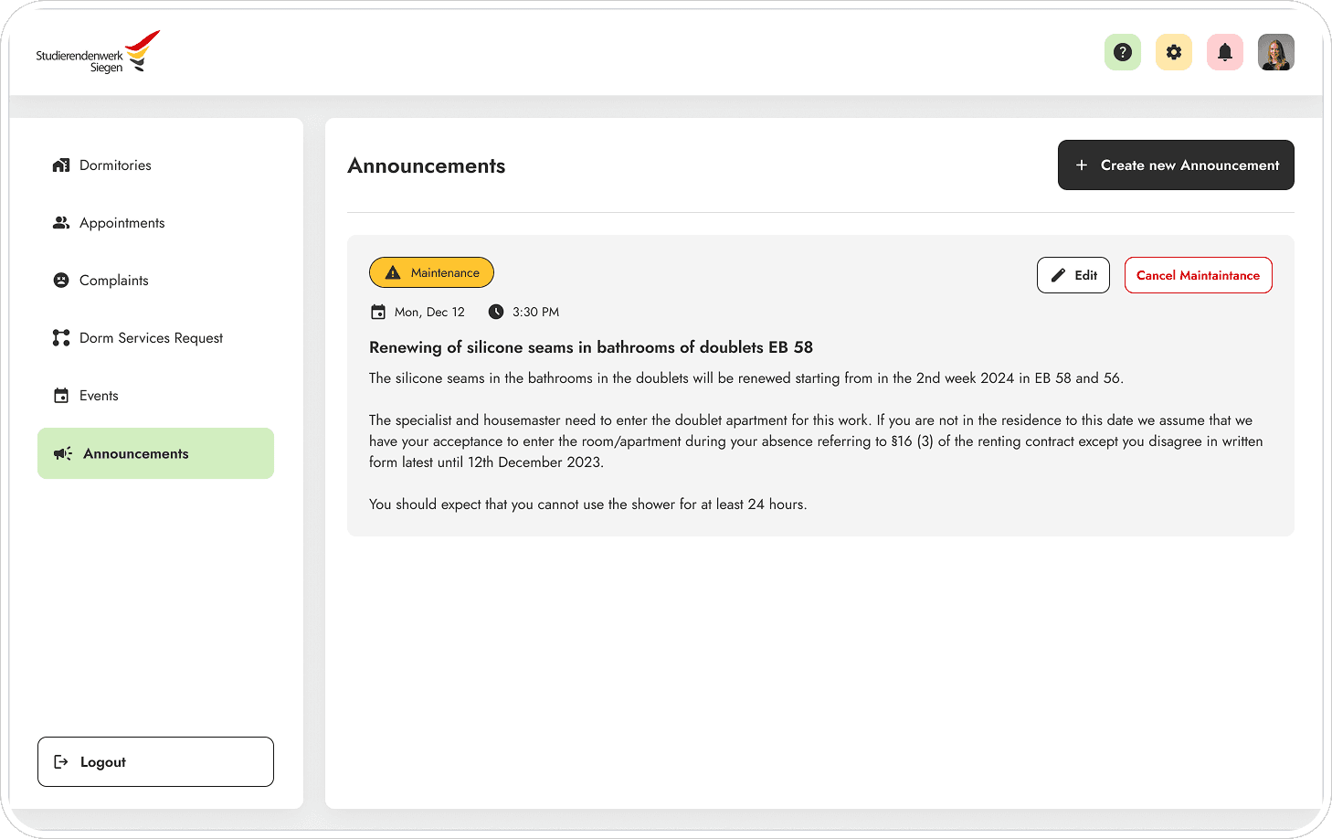 The admin side centralizes everything staff previously managed across email threads, phone logs, and spreadsheets - room applications, maintenance requests, announcements, and occupancy into one panel. The design principle was that every student-facing feature had to reduce the administrative equivalent, not add to it.
