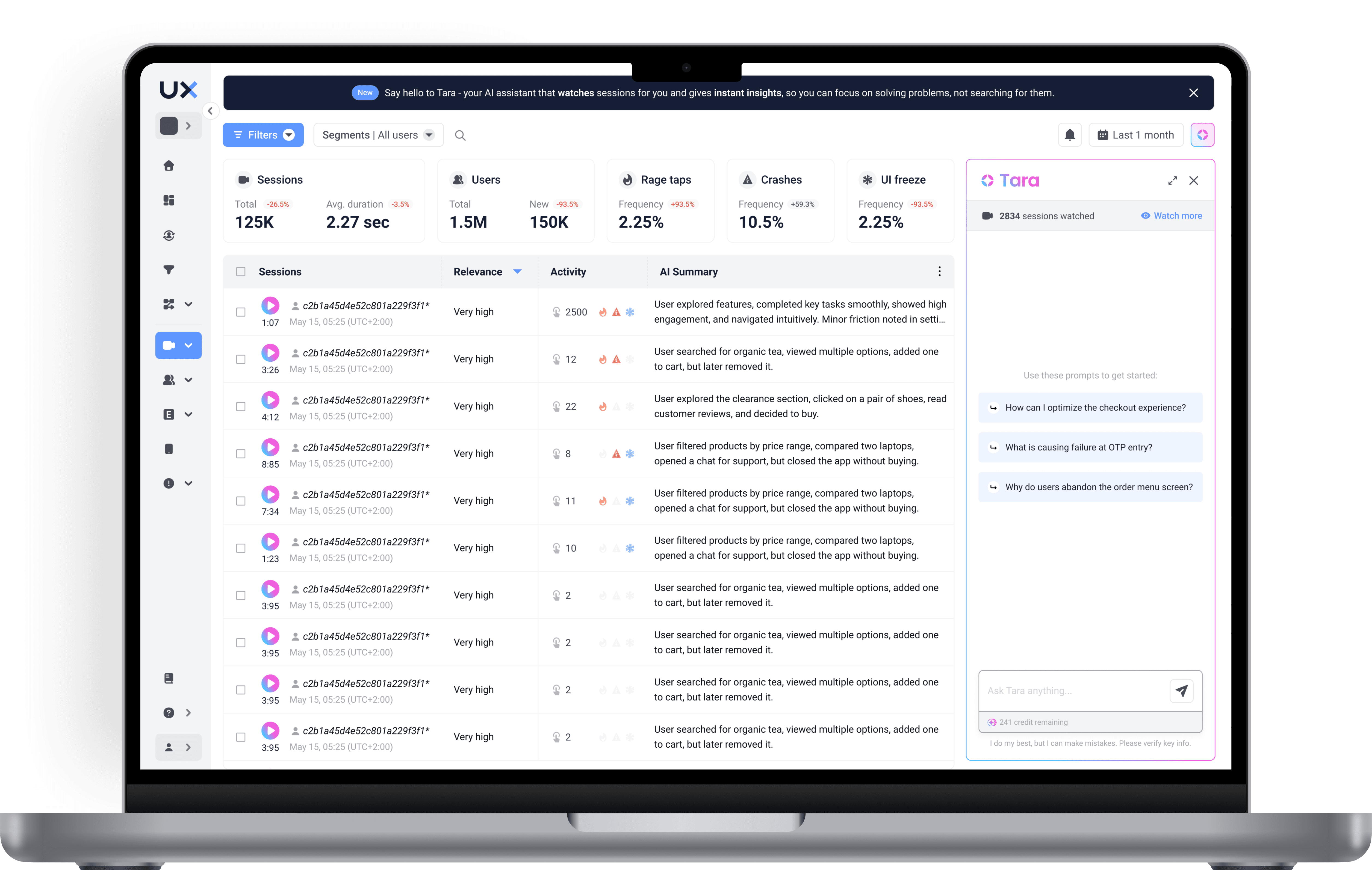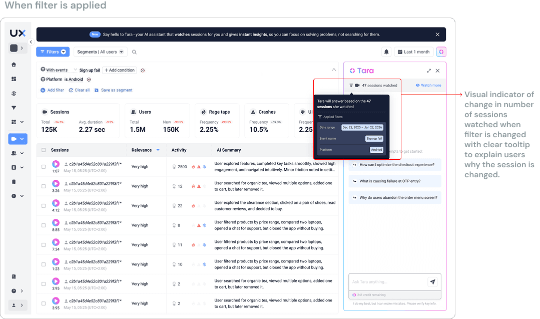 When filters were applied, the analyzed session count now included a clear label distinguishing "X of Y filtered sessions analyzed by Tara." When the count changed due to filtering, a subtle tooltip explained: "This shows analyzed sessions matching your current filters." This resolved the comprehension gap identified in research.